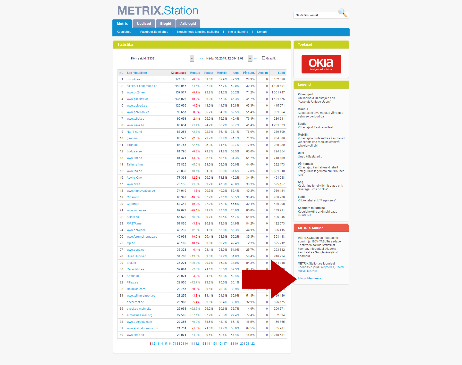 Edasi tuleks juba minna metrix.ee esilehele ja valida rippmenüüst uued liitunud saidid ja sealt otsida oma leht üles ja avada see link ning seda linki saab siis külastusstatistika näha soovijaile jagada.