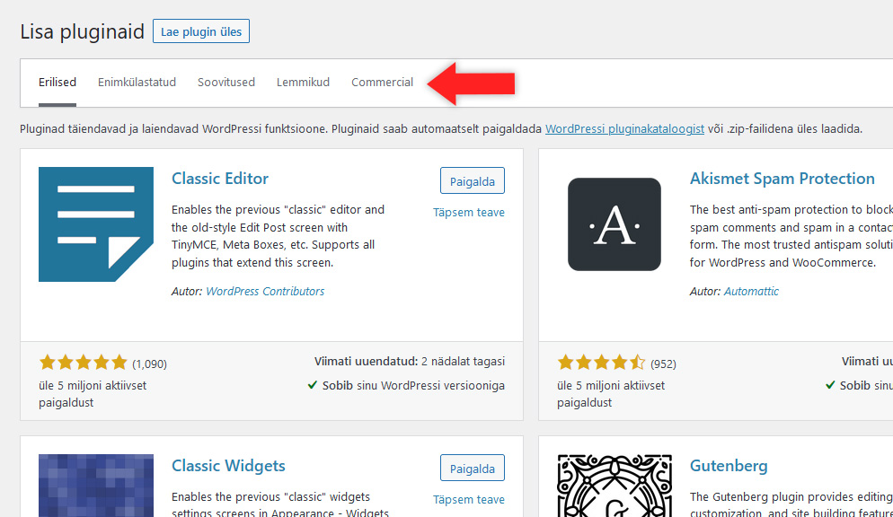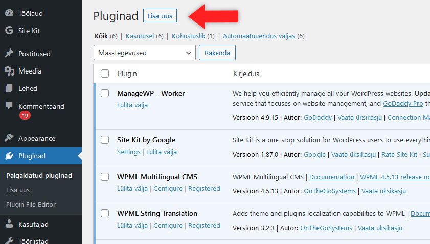 1. Liigu lehele “Pluginad” ja otsi sealt nupp “Lisa uus”