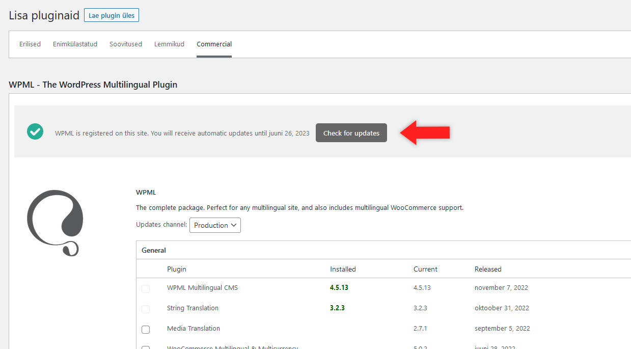 3. Kontrolli kas nimekirjas esimesel real oleva WPML Multilingual CMS järel on Current veerus versiooninumber 4.5.14, kui ei siis vajuta esmalt nuppu “Chek for updates”
