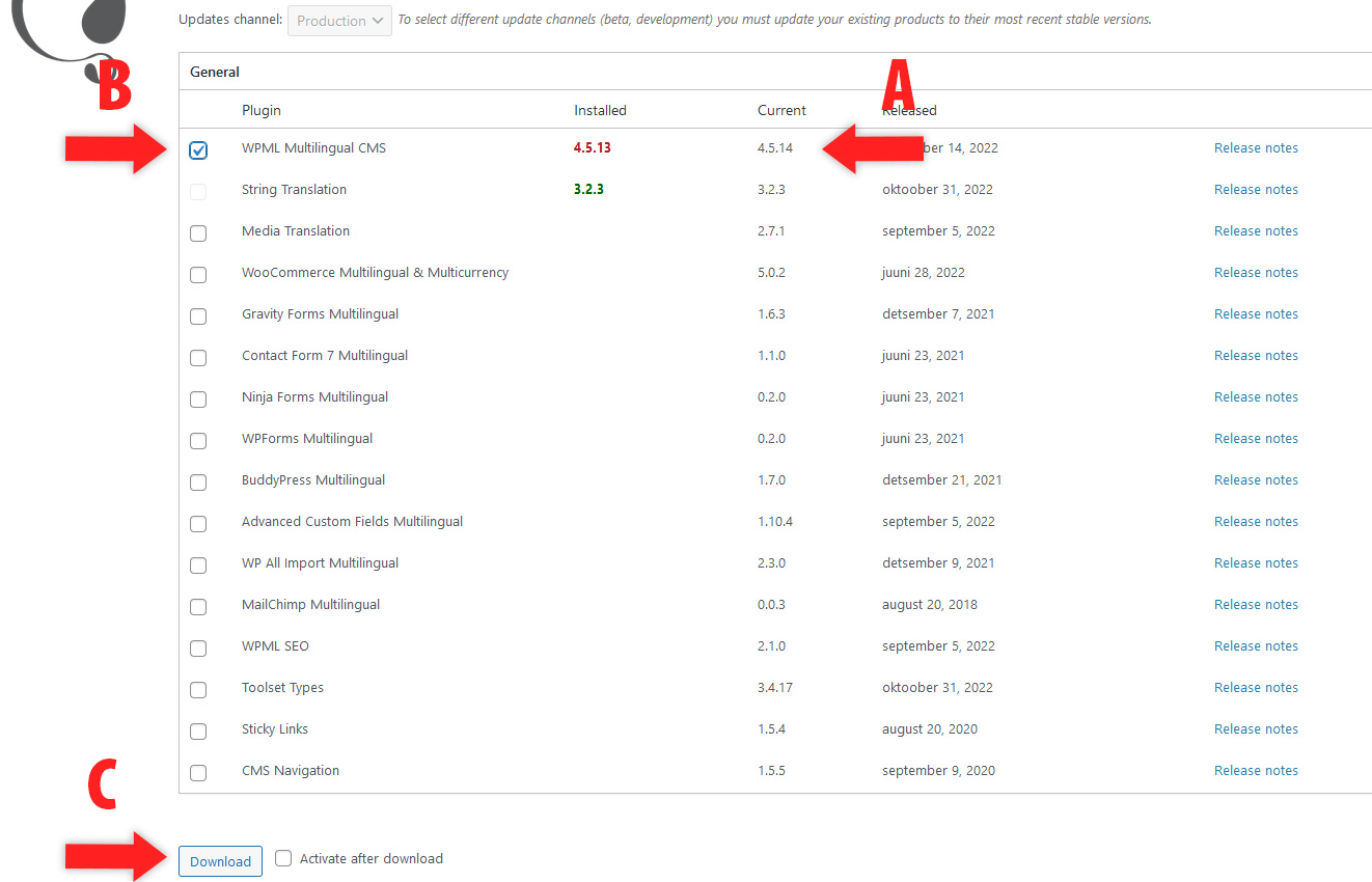 A. Veendu, et tekkib Current veergu WPML Multilingual CMS pluginale versiooninumber 4.5.14